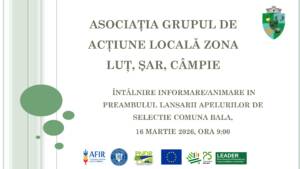 Incepem seria de actiuni de informare/animare in preambulul lansarii apelurilor de selectie din trimestrul 1 al anului 2026 in data de 16 martie 2026 in Comunele Bala,Faragau si Cozma .